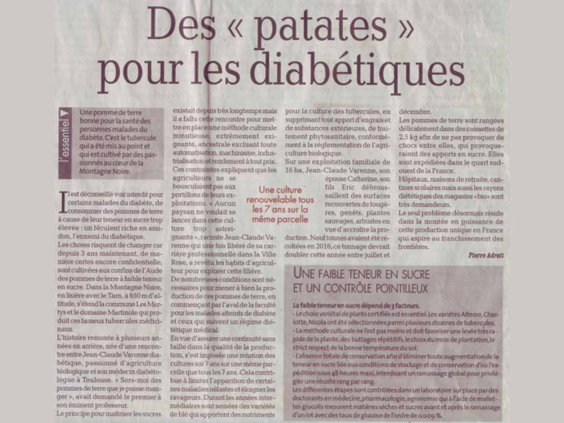 Une pomme de terre bonne pour la santé des personnes malades du diabète. C’est le tubercule qui a été mis au point et qui est cultivé par des passionnés au coeur de la Montagne Noire. Des varietés sélectionnées par le Domaine de la Martinole pour leur adaptation particulière à leur méthode culturale spécifique afin d’obtenir une pomme de terre à la plus faible teneur en sucres possible. Plus d’info